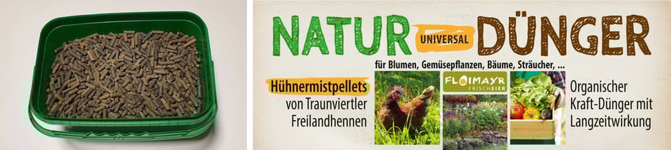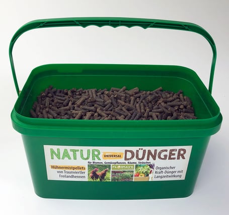 Seit mehr als 50 Jahren auf Hühner & Eier spezialisiert, bieten wir nun auch den Mist unserer Traunviertler Freilandhennen als wirksame und sanfte Hühnermistpellets im 3 kg Kübel für ca. 20 - 30 m² zu düngende Fläche an. Aus guten Gründen steigen immer mehr Gärtner und Pflanzenliebhaber auf Naturdünger oder organischen Dünger um und entscheiden sich für Hühnermist.