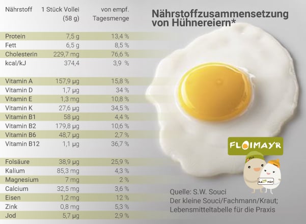 Höchste Eiweißqualität, Kalzium, Phosphor, Magnesium, Kalium und Natrium, außerdem Aluminium, Eisen, Kupfer, Mangan, Zink, Jod und Fluor machen das Ei zu einem der nährstoffreichsten Lebensmittel.